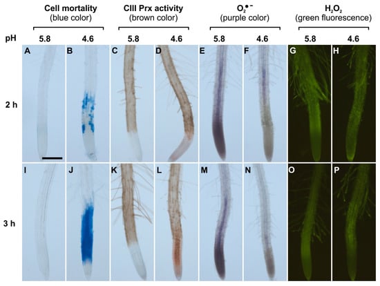 Spatio-temporal correlation between cell mortality, class III peroxidase (CIII Prx) activity, and ROS distribution in roots of Arabidopsis thaliana Col-0 upon low pH stress. Col-0 seedlings were treated at pH 5.8 (A,C,E,G,I,K,M,O) or 4.6 (B,D,F,H,J,L,N,P) for 2 h (upper panels) or 3 h (lower panels). Cell mortality was examined staining with Evans blue. Endogenous CIII Prx activity (total activity without distinction among the isoforms) was detected with a guaiacol/H2O2 assay. The detection of O2●− was performed using nitro blue tetrazolium chloride (NBT). The detection of H2O2 was realized using hydroxyphenyl fluorescein (HPF). Scale bar: 200 μm. Three independent experiments (n = 10) were performed with similar results and representative images are shown. Details of root zones are presented in Supplementary Materials Figure S1.
