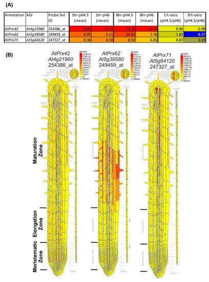 Supplementary materials can be found at https://www.mdpi.com/1422-0067/21/19/7191/s1. Supplementary Table S1: Transcriptomics data mining for CIII Prx multigenic family expression following low pH treatment of A. thaliana roots reveals AtPrx62 as the most promising candidate gene for involvement in low pH-induced cell death in roots. Supplementary Figure S1: Identification of root zones in 5 day old seedlings of A. thaliana (Col-0) based on activity of CIII Prx and O2•− distribution. Supplementary Figure S2. Measurement of H2O2 in root tips of A. thaliana (Col-0) after treatment at pH 5.8 or 4.6. Supplementary Figure S3. CIII Prx activity in A. thaliana Col-0 and atprx62-1 (KO mutant) treated at pH 5.8 or 4.6 for 2 h. Supplementary Figure S4. NBT reaction showing O2•− distribution in roots of A. thaliana Col-0 and atprx62-1 (KO mutant) treated at pH 5.8 or pH 4.6 for 2 h. Supplementary Figure S5. Biological replicates for whole-mount in situ hybridization.