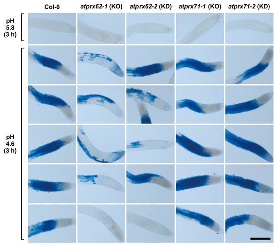 Analysis of low pH-induced cell death phenotypes in atprx62 and atprx71 mutants treated with strong low pH stress for 3 h. Roots treated at pH 5.8 or 4.6 for 3 h were stained with Evans blue. The blue color indicates cell mortality. From left to right: Col-0, atprx62-1 KO mutant, atprx62-2 KD mutant, atprx71-1 KO mutant, atprx71-2 KD mutant. KO: knockout; KD: knockdown; Scale bar: 200 µm. This initial screening was performed with 10 biological replicates (roots from individual seedlings). From at least 13 roots, five representative images are shown for each genotype upon pH 4.6. Note that only atprx62-1 displayed a clear reduced cell mortality phenotype. For simplification, one image is shown for each genotype upon pH 5.8 (control), but in none of the genotypes was there cell death in these control root repeats.