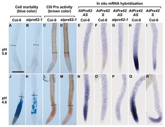 Interestingly, Col-0 roots treated at pH 4.6 and hybridized with AtPrx62 antisense probe showed a significant signal in TZ, MZ, and early EZ (Figure 4N; Supplementary Materials Figure S5) when compared with the sense probe hybridization (Figure 4O; Supplementary Materials Figure S5). This signal was coincident with the zone of cell death (Figure 4J; Supplementary Materials Figure S5). The lack of signal was also confirmed in roots of atprx62-1 treated at pH 4.6 and hybridized with the antisense probe for AtPrx62 (Figure 4P; Supplementary Materials Figure S5). The specificity of the AtPrx62 expression pattern at pH 4.6 was strengthened by the observation of a constitutive expression pattern for AtPrx42 (Figure 4H,I,Q,R; Supplementary Materials Figure S5). These results corroborated, from a spatiotemporal point of view, the transcriptomics values and ratios (Figure 2A). Importantly, the in situ hybridization has allowed demonstrating the spatiotemporal correlation between the low pH-induced AtPrx62 expression and cell death zone (MZ, TZ, and early EZ) upon low pH treatment, thus suggesting that AtPrx62 was involved in low pH-induced cell death.