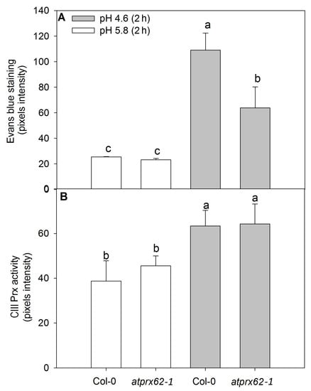 Comparison of cell mortality and CIII Prx activity in roots of Arabidopsis thaliana Col-0 and the atprx62-1 (KO mutant) treated at pH 5.8 or 4.6 for 2 h. The pixels from the images were counted in regions of interest extending up to 500 µm from root tips stained with Evans blue (cell death) or up to 350 µm from root tips stained with a guaiacol/H2O2 assay (CIII Prx activity) (see dashed lines in Figure 4A–D, J–M for examples). (A) The increase in pixels’ intensity indicates an increase in cell death. (B) The increase in pixels intensity indicates an increase in CIII Prx activity. The bars are the standard error of three independent experiments. Different letters (a, b and c) indicate significant differences Statistical analysis was performed by Duncan’s test. Note the good correlation between low pH-induced cell death and CIII Prx activity. Note that the decreased cell death observed in atprx62-1 as compared to WT was not followed by a reduction in CIII Prx activity.
