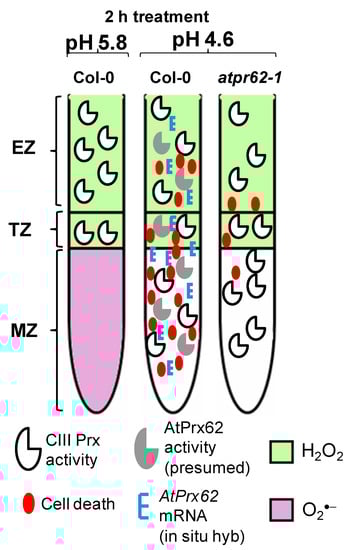 Our results indicate that AtPrx62 spatiotemporal expression is positively correlated to the low pH-induced cell death in MZ, TZ, and early EZ as described in our model (Figure 6). The most compelling indications for this are as follows: (i) the expression of AtPrx62 in low pH-treated Col-0 roots increased in TZ, MZ, and early EZ, and this was correlated with the observed pattern of cell death upon low pH stress; (ii) cell death was greatly suppressed in MZ, TZ, and early EZ of the atprx62-1 KO mutant treated at pH 4.6 compared to Col-0, despite the increase in total CIII Prx activity at pH 4.6 observed in these zones for both Col-0 and atprx62-1.