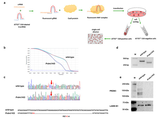 Workflow for the identification of the clustered, regularly interspaced short palindromic repeats/CRISPR-associated protein 9 (CRISPR/Cas9)-mediated Prdm3 gene deletion in the P19 cells. (a) Graphic illustration of the CRISPR/Cas9 genome editing approach for the enrichment and propagation of the cell clones. (b) High-resolution melting (HRM) curve analysis of the wild-type (control) and CRISPR/Cas9-edited P19 cells. The curve shift indicates that there were deletions in the CRISPR/Cas9-edited genome sequence. (c) A comparison of the sequencing results confirmed that the genome editing was efficient. The edited cells displayed a 59 bp deletion and a 2 bp insertion in the exon 4 sequence compared to the wild-type cells. (d) The gel image indicated the faster migration of the shorter amplicon size (Prdm3 KO) relative to the wild-type cells on a 3% agarose gel. M: DNA-sized ladder. (e) The absence of the PRDM3 (PRDI-BF1 (positive regulatory domain I-binding factor 1) and RIZ1 (retinoblastoma protein-interacting zinc finger gene 1) homologous domain-containing transcription factor 3) protein in the Prdm3 KO cells was confirmed using Western blotting. LAMIN B1 was used as a loading control.