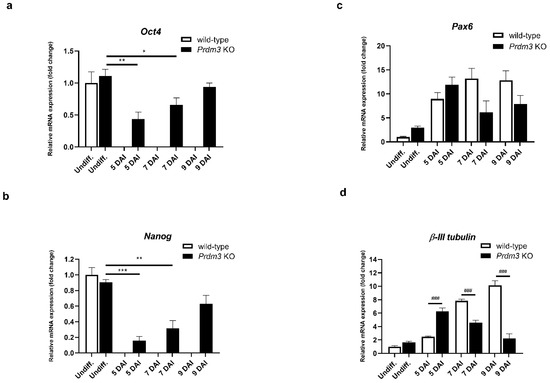 Prdm3 knockout impeded the RA-induced neurogenesis in the P19 cells, as seen via the qRT-PCR analysis of the (a) Oct4, (b) Nanog, (c) Pax6, and (d) β-III tubulin mRNA levels during the neurogenesis in the PRDM3-deficient versus wild-type P19 cells. The undifferentiated P19 cells represent the control group and the 5–9 DAI labels signify the days following the cell plating and the RA induction. Gapdh was used as the reference gene. The error bars are shown as the mean ± S.E.M., n = 3 per group. * p < 0.05, ** p < 0.01, and *** p < 0.001 versus the undifferentiated cells, and ### p < 0.001 compared to the wild-type cells within the individual DAI.