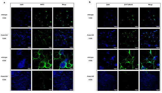 Additionally, we validated a cytoskeleton protein specific for mature neurons, microtubule-associated protein 2 (MAP2) [34], and β-III TUBULIN [33] using immunofluorescence staining (Figure 4). The PRDM3-deficient cells were highly MAP2- and β-III TUBULIN-positive at 5 DAI compared to the control cells, but they were barely detectable at 9 DAI. Conversely, the wild-type cells displayed enhanced MAP2 and β-III TUBULIN protein expression with a well-defined neuronal morphology at 9 DAI (Figure 4a,b).