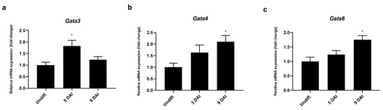 The Gata3, Gata4, and Gata6 mRNA expressions were upregulated during the neurogenesis in the P19 cells, as seen in the RT-qPCR analysis of the (a) Gata3, (b) Gata4, and (c) Gata6 mRNA expressions. Gapdh was used as the reference gene. The control group is abbreviated as Undiff., which represents the gene expression in undifferentiated P19 cells; 5–9 DAI represents the days after the RA induction. The error bars are shown as the mean ± S.E.M., n = 3 per group, * p < 0.05.