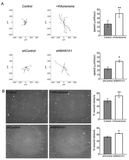 To test the effect of high mannose N-glycans on the migration of MSCs in vitro, we performed videomicroscopy, where the displacement of individual cells is tracked over time, and a wound/scratch assay, where migration of cells is assessed by means of closing a gap or “wound” in the monolayer of cells. Using videomicroscopy, treatment with either Kifunensine or shMAN1A1 caused a two-fold increase in cell migration, as compared to their respective controls (Videos S1A,B and Figure 1A). These results were confirmed with the wound/scratch assays, where both Kifunensine and shMAN1A1 induced a significant increase in cell migration, as compared to their respective controls (Figure 1B).
