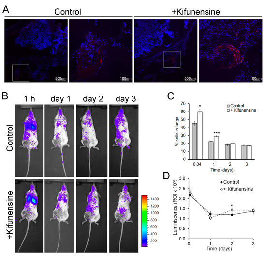 In a second mouse model, immune-deficient NSG mice underwent ligation of a femoral artery, to induce hind limb ischemia [25,26]. One day after surgery, luciferase-expressing MSCs (treated as above) were injected via the tail vein. Cell distribution was then monitored based on luminescence. As shown in Figure 2B, at any of the measured time points, no significant number of cells could be detected preferentially in the ischemic limb. However, we noticed that treatment with Kifunensine increased the concentration of MSCs in the lungs both at one hour and 24 h after injection (Figure 2C). Since the lungs and other filtering organs are well known to be tissues where MSCs lodge following systemic administration (likely due to steric hindrance [10,14]), our results suggest that Kifunensine increases passive cell migration (i.e., cells being carried by the blood flow). To confirm that the effect of Kifunensine was on cell distribution and not on total cell numbers, we also measured total luminescence in the mice. We observed no major differences from controls, with exception of a small but significant increase of Kifunensine-treated cells 48 h after injection (Figure 2D). In consequence, these experiments suggest that although Kifunensine did not increase the tropism of MSCs toward areas of ischemia, it did favor the passive flow of the cells in the blood, possibly reducing the loss of cells in circulation.