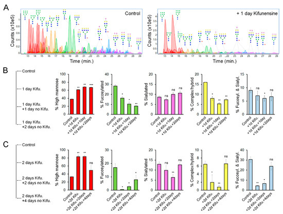 We hypothesized that the effect of Kifunensine on N-glycans would be transitory and reversible. To precisely determine the dynamic changes of N-linked glycoforms (N-glycoforms) induced by Kifunensine, we used NanoLC/ESI-QTOF-MS (see Figure 3A for representative chromatograms). Here, we used two approaches. First, cells were cultivated for one day with or without Kifunensine. Then, the culture media was changed to standard culture media without Kifunensine. The cells were then cultured for an additional one and two days (Figure 3B). Following this approach and time points, the effect of Kifunensine was not reversed to basal levels. We also observed that the increase of high mannose correlated with a decrease of fucosylated N-glycans and complex or hybrid N-glycans. In contrast, the proportion of sialylated and both sialylated and fucosylated N-glycans did not change or was only minimally affected.