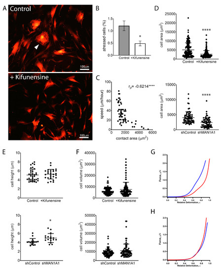 High mannose N-glycans promote changes in cell shape. (A) Representative images of MSCs expressing tdTomato, treated with or without Kifunensine. A “stressed” cell is indicated with the white arrowhead. Cells with Kifunensine also tend to look smaller. (B) Semiquantification of “stressed” cells (cells with morphological features as shown in A) (n = 4). (C) Correlation of cell size (contact area) and speed, as measured in control cells. Dots indicate individual cells and Pearson’s coefficient is shown in the upper right corner. (D) Contact area measured on cells visualized under a phase-contrast microscope. (E) Cell height measured by AFM. (F) Cell volume calculated by measuring cell radius on cells in suspension (under hemocytometer). For (D–F), n = 3 for both top and bottom graphs. (G) Force–deformation profiles of a representative shControl (blue) and shMAN1A1 (red) cell. (H) Force–deformation profiles of representative control (blue) versus Kifunensine-treated (red) cells. * p < 0.05, **** p < 0.00005.