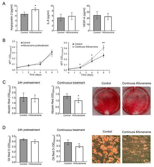 Finally, we investigated if Kifunensine could affect proliferation, the secretion profile of angiogenic signals, or the osteogenic and adipogenic differentiation potential of the cells. To test the effect of Kifunensine on the secretion of angiogenic signals Angiopoietin 2, Interleukin 8 (IL-8) and Vascular Endothelial Growth Factor (VEGF-A), MSCs were treated for 24 h with or without Kifunensine, and then cultured for one additional day with or without Kifunensine. Angiogenic factors were then measured by ELISA. As shown in Figure 6A, treatment with Kifunensine induced a significant increase in secreted Angiopoietin 2 levels, but did not affect the secretion of IL-8 or VEGF-A. Cell proliferation was measured using MTT, where we found that cells cultured continuously with Kifunensine for up to six days, showed a significant increase in cell proliferation (Figure 6B).