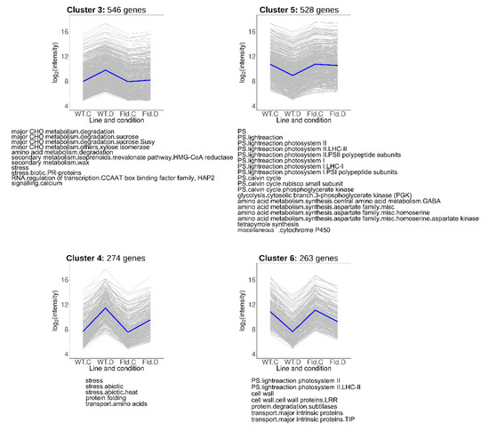 Clustering of DE transcripts allows identification of gene groups that display similar expression patterns and presumably share common regulatory pathways. Leaf transcripts detected in our microarray were thus grouped into 47 clusters of widely different size. The more populated (27,622 members, ~85% of all leaf-expressed genes) included transcripts whose levels were not affected by treatment or genotype. Of the remaining 46 clusters containing genes differentially expressed in response to water limitation and/or Fld presence (4847 genes), we focused in 13 clusters that were either highly populated or enriched in pathways and functional categories associated to stress responses, redox biochemistry and chloroplast functions, comparing vis-à-vis those that exhibited contrasting expression behaviors (e.g., induction vs. repression). DE transcripts contained in these clusters can be found in Tables S4–S6, while the other 33 clusters are described in Figure S3.