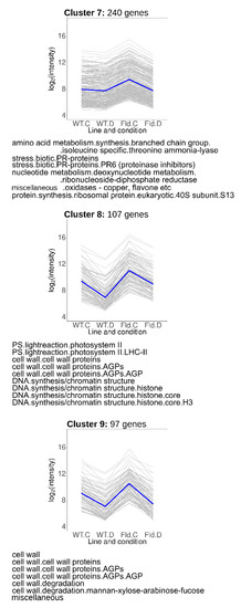 Genes grouped in Clusters 7–9 (Figure 6) were induced under control conditions in Stpfld252 plants, accompanied by drought-related repression in the transformant (Cluster 7), or in both lines (Clusters 8 and 9). Cluster 7 (240 members) included genes associated to biotic stress, amino acid synthesis and protein and nucleotide metabolism (Figure 6, Table S5). Cluster 8 was enriched in photosynthetic genes, particularly components of PSII and its light-harvesting antenna, and cell wall proteins. Finally, cluster 9 included fasciclin-like arabinogalactan proteins, which were reported to participate in fiber initiation and elongation, and to contribute to the integrity of the primary cell wall matrix [33]. DE transcripts belonging to the cell wall functional category were also shared with Clusters 2 and 6.