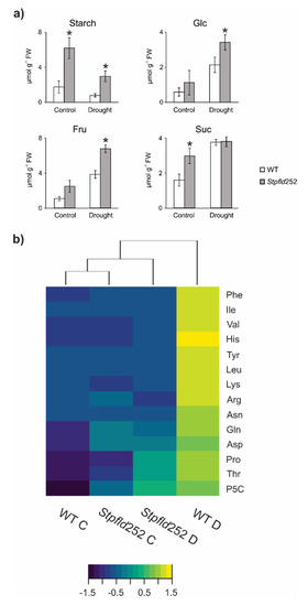 When plants were grown in the absence of stress, contents of starch and the soluble carbohydrates glucose, fructose and sucrose were higher in Stpfld252 leaves compared to WT siblings (Figure 8a). Water limitation, in turn, led to a major decline in starch in both WT and Stpfld252 leaves, with concomitant increases in soluble sugars (Figure 8a).