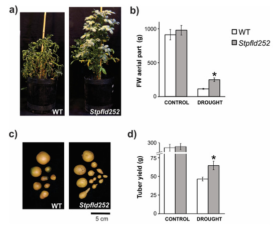 Water restriction affected aerial growth in both lines, but significantly less in the transformant. Compared to control watered conditions, stressed WT plants accumulated only 10% aerial fresh weight (FW) at the end of the 90-days treatment, whereas Stpfld252 siblings reached ~25% (Figure 9a,b). Differential stress protection by Fld was also reflected at the level of tuber production. Water limitation reduced tuber yield by more than 80% in WT plants, but less than 70% in their Stpfld252 counterparts (Figure 9c,d), resulting in absolute yields of 65 ± 6 vs. 48 ± 2 g per plant for Stpfld252 and WT lines, respectively (Figure 9d).
