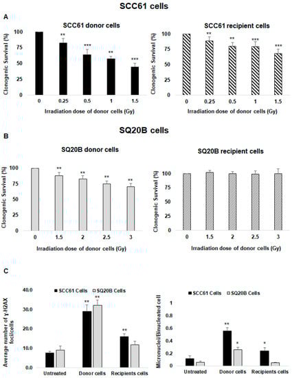 Assessment of targeted and nontargeted effects: clonogenic survival assays were performed in donor and recipient cells 12 days following X-ray irradiation (donor cells) or incubation in culture medium in which donor cells had been cultured for 2 h (recipient cells) as described in the Materials and Methods section. Survival was measured in (A) SCC61 cells and (B) SQ20B cells. (C) The average numbers of H2A.X foci and micronuclei per cell were determined using immunofluorescence assay in SCC61 and SQ20B donor cells (1.5 Gy and 3 Gy, respectively) and in corresponding recipient cells. The results are the mean ± SD of three experiments performed in triplicate. * p < 0.05, ** p < 0.01, and *** p < 0.001 compared with untreated cells.
