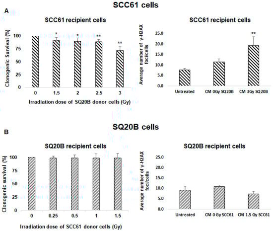 Bystander effectors are radio-induced in SQ20B cells. To assess whether SQ20B cells could induce bystander factors, culture mediums were exchanged between SCC61 and SQ20B cells and clonogenic survival and induction of γ-H2A.X foci were evaluated. (A) SCC61 recipient cells were incubated with conditioned medium from SQ20B donor cells, and (B) SQ20B recipient cells were cultured in medium from SCC61 donor cells. The results are the mean ± SD of three experiments performed in triplicate. * p < 0.05, ** p < 0.01, compared with untreated cells.