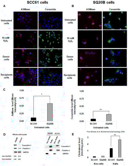 Cell membrane reorganization was radio-induced in radiosensitive SCC61 cells but not in radioresistant SQ20B cells. ASMase activation and ceramide production were measured using immunofluorescence in (A) SCC61 cells (donor and recipients) and (B) SQ20B cells (donor and recipients). (C) ASMase and ceramide levels in basal condition (untreated) in SCC61 and SQ20B cells were quantified using immunofluorescence images. (D) Lipid raft markers were assessed using western blotting in both SCC61 and SQ20B cells in the total lysate or in the fractionated Triton-soluble membrane (non-rafts) and lipid raft (rafts) fractions as described. (E) Cholesterol level was measured in non-raft and raft fractions isolated from SCC61 and SQ20B cells in basal conditions. The results are the mean ± SD of three experiments performed in triplicate. * p < 0.05, ** p < 0.01.