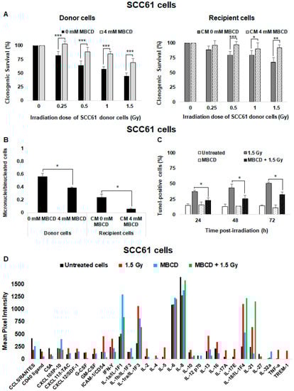 Role of lipid raft formation in radiosensitive SCC61 cells: SCC61 donor cells were preincubated for 30 min with 4 mM methyl-β-cyclodextrin (MBCD; lipid raft disruptor) before irradiation in the presence of MBCD. After irradiation, the medium was removed and (A) clonogenic survival was determined in donor cells and in recipient cells. (B) The number of micronuclei per cell was determined in donor cells in the presence or absence of MBCD and in their corresponding recipient cells. (C) Apoptosis was measured by a TUNEL assay in SCC61 donor cells preincubated or not with 4 mM MBCD for 30 min before irradiation. The results are the mean ± SD of three experiments performed in triplicate. * p < 0.05, ** p < 0.01, and *** p < 0.001 compared with cells treated only with radiation. (D) The expression of cytokines secreted in conditioned medium from untreated, irradiated (1.5 Gy), and MBCD + irradiated SCC61 cells was evaluated using the Human Cytokine Array (Proteome Profiler Array; R&D Systems, Minneapolis, MN, USA). For each cytokine, ImageJ software was used to determine pixel intensity.