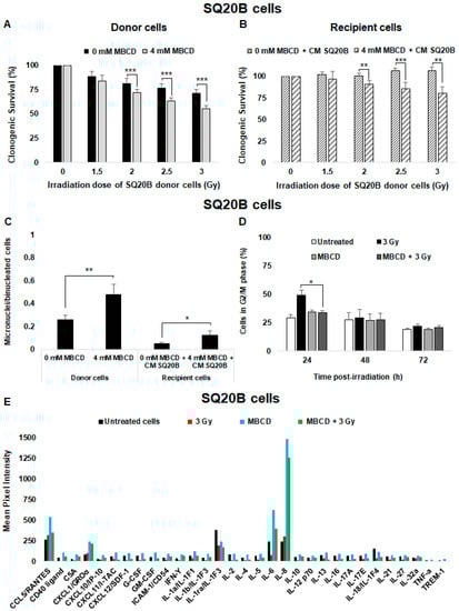 Lipid raft disruption sensitizes SQ20B donor cells to radiation and induces nontargeted effects. SQ20B donor cells were preincubated for 60 min with 4 mM MBCD (lipid raft disruptor) before irradiation in the presence of MBCD. After irradiation, the medium was removed and (A) clonogenic survival was determined in donor cells. (B) Clonogenic survival of SQ20B recipient cells was co-incubated or not with MBCD before transfer of the CM from SQ20B donor cells. (C) The number of micronuclei per cell in SQ20B donor and recipient cells in the presence or absence of MBCD was quantified. (D) The percentage of cells in G2/M phase was determined using flow cytometry in SQ20B donor cells in the presence or absence of MBCD. The results are the mean ± SD of three experiments performed in triplicate. * p < 0.05, ** p < 0.01, and *** p < 0.001 compared with cells treated only with radiation. (E) The expression of cytokines secreted in the CM from untreated, irradiated (3 Gy), and MBCD + irradiated SQ20B cells was evaluated using the Human Cytokine Array (Proteome Profiler Array; R&D Systems, Minneapolis, MN, USA). For each cytokine, ImageJ software was used to determine pixel intensity.