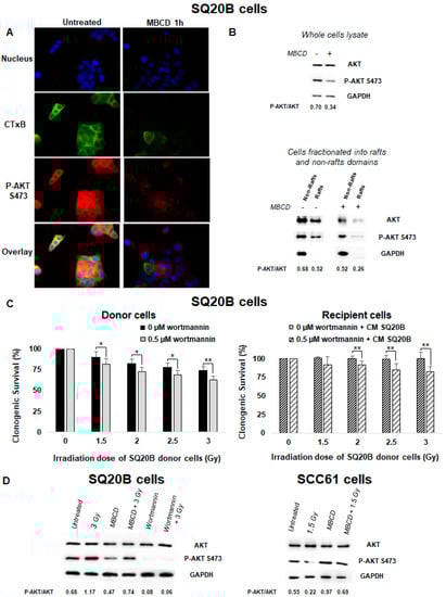An endogenous AKT protein resides in lipid raft fractions of SQ20B cells and confers resistance to targeted and nontargeted effects. (A) SQ20B cells treated without (untreated) or with MBCD were incubated with Alexa-488-conjugated cholera toxin B (CTxB) following incubation with p-AKT S473. (B) SQ20B cells were pretreated in the presence or absence of MBCD, and total cell lysates (upper panel) or fractions isolated from non-raft and raft domains (bottom panel) were subjected to SDS-PAGE followed by western blotting for p-AKT S473. (C) SQ20B cells were preincubated or not with the phosphatidylinositol-3-kinase (PI3K) inhibitor (0.5 µM wortmannin) for 60 min followed by irradiation (donor cells) or CM from SQ20B donor cells (recipient cells), and clonogenic survival was determined. The results are the mean ± SD of three experiments performed in triplicate. * p < 0.05, ** p < 0.01, compared with cells treated only with radiation. (D) p-AKT S473 was expressed in total cell lysates of SQ20B and SCC61 cells in the presence or absence of MBCD or wortmannin.