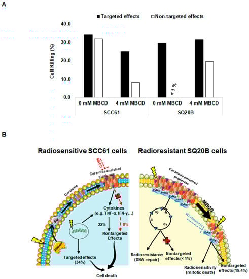 Using experimental data obtained from donor and recipient cells (Figure 1A,B), we could establish the relative contribution of targeted and nontargeted cytotoxicity in our two cell lines (Figure 7A). In radiosensitive SCC61 cells, targeted and nontargeted cytotoxic effects induced 34.1% and 32% of cell death, respectively (Figure 7A). This suggests that at least 50% of cell killing is due to nontargeted effects in SCC61 cells. By contrast, cell death resulted only from targeted effects (29.7%) in radioresistant SQ20B cells. Similarly, we determined the lipid raft-mediated targeted and nontargeted cytotoxicity. We showed that the contribution of lipid raft in the targeted cytotoxic effects represents about 27% (i.e., 9.1% of 34.1%) and about 75% for the nontargeted effects (i.e., 24% of 32%) in SCC61 cells. For SQ20B cells, lipid raft-mediated targeted effects were lower: 6% (i.e., 1.8% of 31.5%) and higher (98%) for nontargeted effects (19.2% of 19.4%). These data suggest that, after cholesterol depletion, the occurrence of nontargeted cytotoxic effect was mainly responsible for the radiosensitization observed in SQ20B cells.