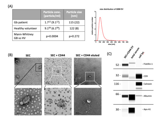 Yield and characteristics of serum-derived extracellular vesicles. (A) NTA of extracellular vesicles (EVs) isolated from 500 µL serum by size-exclusion chromatography (SEC) to determine the yield and particle size. The table states the mean particle concentration and mean modal size of 55 glioblastoma patients and 5 healthy volunteers (HV). Standard deviation is given in parentheses; histograms: exemplary size distribution of glioblastoma-EVs measured by NTA. (B) Transmission electron microscopy images showing the typical EV morphology. Scale bar represents, in all images, 200 nm in the upper row (30k × magnification) and 100 nm in the lower row (110k × magnification). Images in the left lane show EVs after SEC, middle lane images show CD44-captured SEC-EVs, and right lane images represent EVs that were diluted from CD44-beads. (C) Wes ProteinSimple immunodetection confirming the presence of the EV-markers flotillin-1 and CD9 and the absence of non-EV protein calnexin in SEC + CD44 EV preparations. Cell and total serum lysates were used as positive controls for the non-EV marker calnexin, apolipoprotein A1, and serum albumin, respectively. NTA = nanoparticle tracking analysis; cell lys = cell lysate of PBMCs (1:10) or glioblastoma cell line Gli36 (1:100); Apo-A1 = apolipoprotein A1.