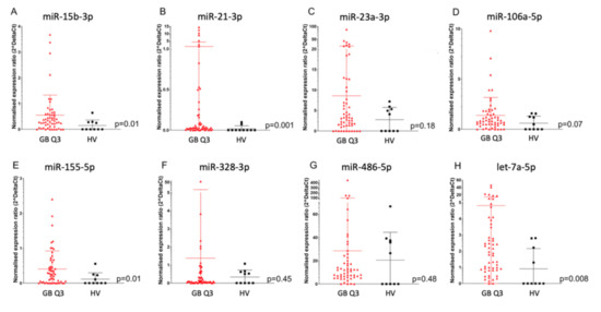 When comparing SEC + CD44-purified EV microRNA from the serum of glioblastoma patients to HV, we saw significantly higher levels of miR-15b-3p, miR-21-3p, miR-155-5p, and let-7a-5p in glioblastoma patients (p = 0.01, p = 0.001, p = 0.01, and p = 0.008, respectively) and a non-significant trend for miR-23a-3p and miR-106a-5p (p = 0.18 and p = 0.07, respectively), while no significant difference was detected for miR-23a-3p, miR-328-3p, and miR-486-5p (p = 0.45 and p = 0.48 respectively, Figure 3A–H).