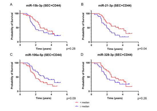 The four microRNAs that were identified as putative prognostic markers were selected for dichotomous assessment based on the median of the normalized expression ratios and using Kaplan–Meier curves for data visualization. To define the subgroups, we calculated the median value of the normalized expression for each microRNA and split the patients into two groups, with one group including patients with expression values lower than the median and the other group with values equal to or higher than the median. In an analysis of single SEC + CD44 EV microRNAs, we saw a curve separation for all four miRNAs, which was less pronounced for miR-15b-3p and miR-328-3p (Figure 4A–D). Consistent with our correlation data, the subgroup of patients with levels of miR-106a-5p higher than the median had a clear survival benefit compared to those with lower levels, as opposed to miR-21-3p, where high levels of the miRNA defined a prognostically inferior group (Figure 4B,C).