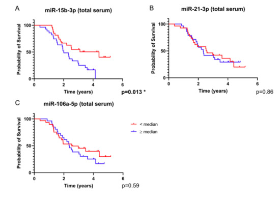 Survival analysis based on total serum microRNA expression. Depicted are survival curves using a dichotomous assessment based on microRNA levels ((A) miR-15b-3p, (B) miR-21-3p, (C) miR-106a-5p) from total serum of glioblastoma patients (n = 55). Red color indicates patients with values equal to or higher than the median and blue color represents values lower than the median normalized expression ratio. For miR-328-3p, no graph was generated because more than 50% of the values were non-measurable. Note that the separation of the curves based on miR-15b-3p is significant after Benjamini–Hochberg correction for multiple testing (Tables S3 and S4).