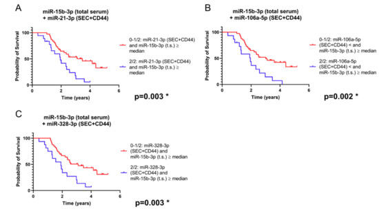 Survival analysis based on a combination of microRNA levels in total serum (t.s.) and/or SEC + CD44 EVs (combinations: miR-15b-3p in t.s. plus (A): miR-21-3p in SEC + CD44 EVs; (B): miR-106a-5p in SEC + CD44 EVs; (C): miR-328-3p in SEC + CD44 EVs). Depicted are survival curves using a dichotomous assessment from glioblastoma patients (n = 55) in both SEC + CD44 separated serum EVs and total serum. Blue color indicates patients whose microRNA profile fulfils both conditions, while red color indicates patients whose profile fulfils at most one out of two conditions. Note that the combination of miR-15b-3p in serum with each of these four microRNAs in SEC + CD44 EVs allowed for a prognostic stratification of this patient population, even after Benjamini–Hochberg correction (Table S1).