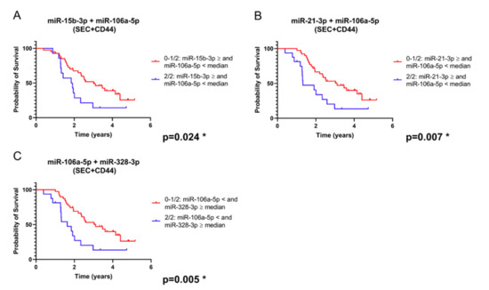 Survival analysis based on the expression of a combination of microRNAs isolated from SEC + CD44 EV (combinations: miR-106a-5p plus (A): miR-15b-3p; (B): miR-21-3p in SEC + CD44 EVs; (C): miR-328-3p). Depicted are survival curves using a dichotomous assessment based on a combination of microRNA levels from glioblastoma patients (n = 55) in SEC + CD44 separated serum EVs. Blue color indicates patients whose microRNA profile fulfils both conditions, while red color indicates patients whose profile fulfils at most one out of two conditions. Note that the combination of miR-106a-5p with each of the other three microRNAs allowed for a prognostic stratification of this patient population, even after Benjamini–Hochberg correction for multiple testing (Tables S3 and S4).