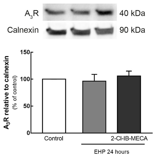 BV-2 cells were exposed to EHP for 24 h, in the presence or absence of an A3R agonist, 2-Cl-IB-MECA (1 µM), and the protein levels of the receptor were assessed by Western blot (Figure 1). The exposure of BV-2 cells to EHP for 24 h, whether in the presence or absence of the agonist, did not significantly change A3R protein levels (96 ± 13% and 106 ± 9% of the control, respectively) when compared with the control.
