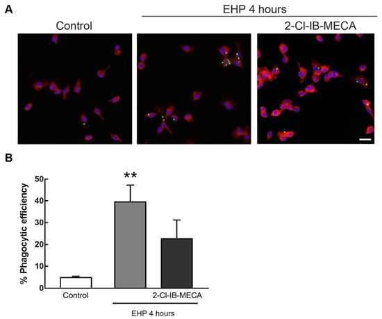 Effect of A3R activation in EHP-induced phagocytic activity of primary retinal microglial cells. Cells were incubated with 1 µM 2-Cl-IB-MECA followed by exposure to EHP for 24 h. Phagocytosis was assessed with fluorescent latex beads. (A) Representative images of primary microglial cells identified by immunocytochemistry with anti-CD11b (red) with incorporated beads (green). Nuclei were stained with DAPI (blue). Scale bar: 50 µm. (B) Phagocytic efficiency was calculated from 4–5 independent experiments. ** p < 0.01, compared with control. Kruskal–Wallis test, followed by Dunn’s multiple comparisons test.