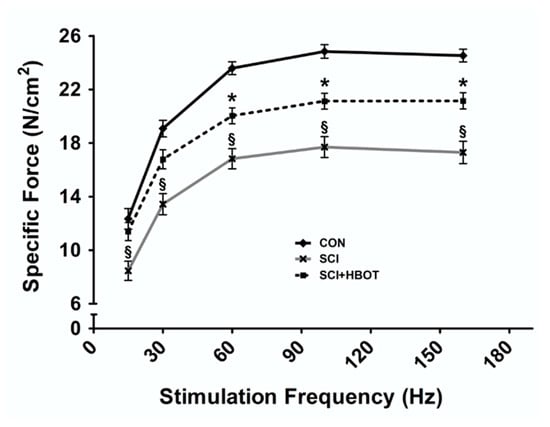 Diaphragm muscle force–frequency response. Values are mean ± SEM. § Significantly different versus all groups (p < 0.05). * Significantly different versus CON group (p < 0.05). CON—non-injured, room air exposure; SCI—lateral-cervical spinal cord contusion, room air exposure; and SCI + HBOT—lateral-cervical spinal cord contusion, HBO therapy.