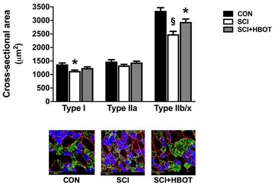 Diaphragm muscle cross-sectional area and fiber typing. Representative fluorescent staining of myosin heavy chain (MHC) I (type I) (DAPI filter/blue), MHC IIa (type IIa) (FITC filter/green), MHC IIb/IIx (type IIb/x) (non-stained) and dystrophin (Rhodamine filter/red) proteins in diaphragm samples are shown below the graph. Scale bar = 100 μm. Values are mean ± SEM. § Significantly different versus all groups (p < 0.05). * Significantly different versus CON group (p < 0.05). CON—non-injured, room air exposure SCI—lateral-cervical spinal cord contusion, room air exposure; and SCI + HBOT—lateral-cervical spinal cord contusion, HBO therapy.