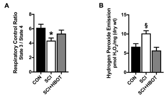 (A) Mitochondrial respiration and (B) mitochondrial reactive oxygen species (hydrogen peroxide) emission. Values are mean ± SEM. § Significantly different versus all groups (p < 0.05). * Significantly different versus CON group (p < 0.05). CON—non-injured, room air exposure; SCI—lateral-cervical spinal cord contusion, room air exposure; and SCI + HBOT—lateral-cervical spinal cord contusion, HBO therapy.