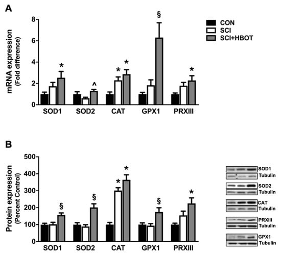 (A) Diaphragm mRNA expression of superoxide dismutase 1 (SOD1), superoxide dismutase 2 (SOD2), catalase (CAT), glutathione peroxidase 1 (GPX1) and peroxiredoxin III (PRXIII). (B) Diaphragm protein expression of SOD1, SOD2, CAT, GPX1 and PRXIII. Representative Western blot images are shown to the right of the graph. Values are mean ± SEM. § Significantly different versus all groups (p < 0.05). * Significantly different versus CON group (p < 0.05). ^ Significantly different versus SCI group (p < 0.05). CON—non-injured, room air exposure; SCI—lateral-cervical spinal cord contusion, room air exposure; and SCI + HBOT—lateral-cervical spinal cord contusion, HBO therapy.