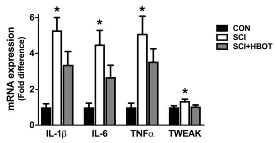 mRNA expression of interleukin 1β (IL-1β), IL-6, tumor necrosis factor α (TNFα) and TNF-related weak inducer of apoptosis (TWEAK). Values are mean ± SEM. * Significantly different versus CON group (p < 0.05). CON—non-injured, room air exposure; SCI—lateral-cervical spinal cord contusion, room air exposure; and SCI + HBOT—lateral-cervical spinal cord contusion, HBO therapy.