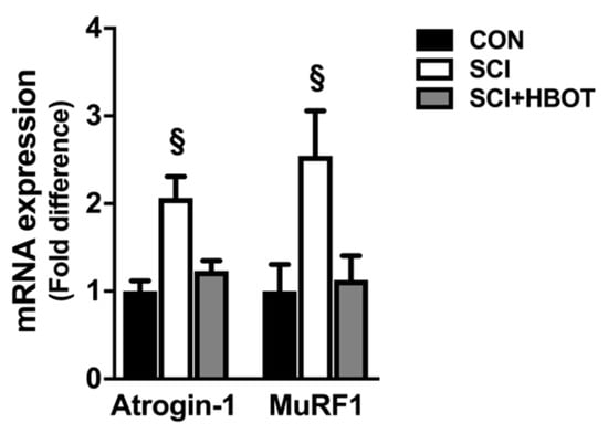 mRNA expression of Atrogin-1/MaFbx and MuRF1. Values are mean ± SEM. § Significantly different versus all groups (p < 0.05). CON—non-injured, room air exposure; SCI—lateral-cervical spinal cord contusion, room air exposure; and SCI + HBOT—lateral-cervical spinal cord contusion, HBO therapy.