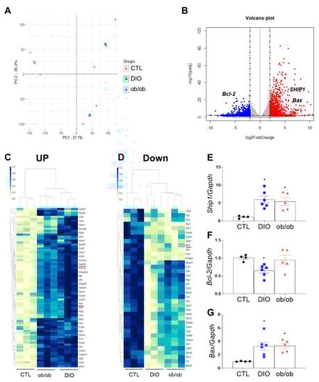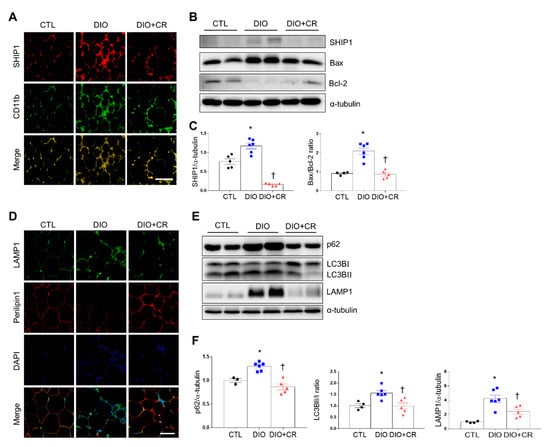 2.5. Effects of CR on SHIP1 Expression Related to Apoptosis and Autophagy in the Adipose Tissue of DIO and ob/ob Mice