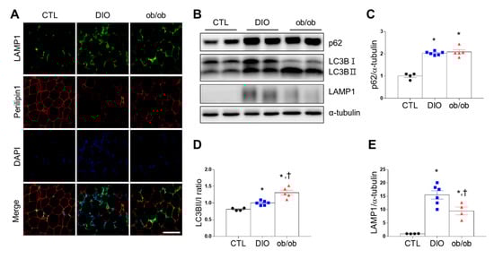 - Ju, L.; Han, J.; Zhang, X.; Deng, Y.; Yan, H.; Wang, C.; Li, X.; Chen, S.; Alimujiang, M.; Li, X.; et al. Obesity-associated inflammation triggers an autophagy-lysosomal response in adipocytes and causes degradation of perilipin 1. Cell Death Dis. 2019, 10, 121. [Google Scholar] [CrossRef]