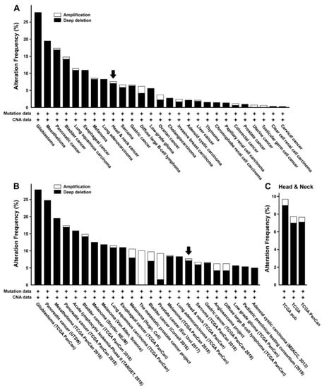 Expression of miR-31 is altered in head and neck cancer, including oral cancer, as well as in other malignant tumors. (A,B) The pooled TCGA PanCancer Atlas ((A), 10,967 samples from 10,953 patients) and curated non-redundant data (B), 47,005 samples from 44,597 patients) available from the cBio portal for cancer genomics [84,85] are shown for a variety of malignant tumors. The fraction of head and neck cancer samples is indicated as arrows in each plot. (C) All available data of head and neck cancer from the cBio portal are pooled together, with 1934 samples from 1932 patients [84,85].