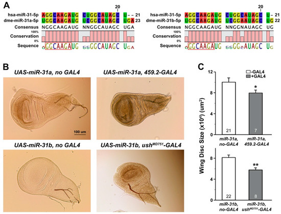 All crosses and stocks were kept on a standard medium at 24 °C with a humidity between 45% and 60%. All fly stocks used in our study were acquired from the Bloomington Drosophila Stock Center (Bloomington, IN, USA), including w*; PBac{UAS-mir-31a.S}VK00037/CyO, w1118; P{UAS-LUC-mir-31a.T}attp2, w1118; P{UAS-LUC–mir-31b.T}attP2, w*; P{GawB}459.2 and y1w*; P{GawB}ushMD751. The 459.2- and ush-GAL4 drivers were used for expression of the UAS-miRNA-31 transgene in the imaginal wing discs of the third instar larvae.