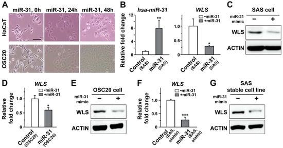 Overexpression of human miR-31 suppressed the transcript level of WLS, its putative target in oral cancer cells. (A) Representative images of HaCaT and OSC20 cells are shown following transient transfection of a miR-31 mimic, an oligonucleotide sequence resembling the mature miR-31, visualizing the effects of miR-31 on cell morphology. Scale bar, 50 µm. (B) The transcript levels of miR-31 (left) and its target, WLS (right), are shown before (control) and after transfection of miR-31 mimics (miR-31) in SAS cells. Mean ± SEM indicated. * p < 0.05 and ** p < 0.01. (C) The protein levels of WLS before and after transfection of the miR-31 mimics are compared in SAS cells. (D,E). The transcript and protein levels of WLS are indicated before and after transfection of miR-31 mimics in OSC20 cells. Mean ± SEM indicated. * p < 0.05. (F,G). As an alternative to transient transfection of the miR-31 mimics, the expression of WLS is quantified at the level of mRNA (F) and its protein product (G) in a SAS cell line stably expressing mature miR-31. Mean ± SEM indicated. *** p < 0.001.
