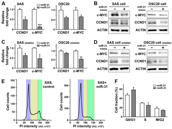 When the miR-31 mimic was transiently expressed in SAS and OSC20 cells, we found a noticeable decrease in the levels of cyclin D1 (CCND1) and c-MYC mRNAs (Figure 5A), two of the most common targets of the canonical Wnt signaling pathway that have been implicated in oral carcinogenesis [93]. Such transcriptional regulation of CCND1 and c-MYC by miR-31 was further translated into a reduced amount of their protein products, as shown in the Western blot analysis (Figure 5B). In line with these results, stable expression of miR-31 in OSCC cells led to consistent decreases in both CCND1 and c-MYC transcripts as well as their protein products (Figure 5C,D). It is important to note that CCND1 and c-MYC are the classic proto-oncogenes involved in regulation of cell cycle and proliferation, thus playing a critical role in development of various types of malignant tumors [94]. Considering the significant downregulation of these proto-oncogenes, it is plausible to predict corresponding miR-31-induced changes in cell cycles of OSCC cells. Indeed, we found a slight shift in the ratio of OSCC cells in the G0/G1 phase over those in the M/G2 phase following stable expression of miR-31 in a subset of SAS cells (Figure 5E), with a similar trend in the pooled data detected, albeit a lack of statistical difference (Figure 5F). These data together may thus suggest a potential cell cycle arrest, preventing these cells from proceeding to further proliferation.