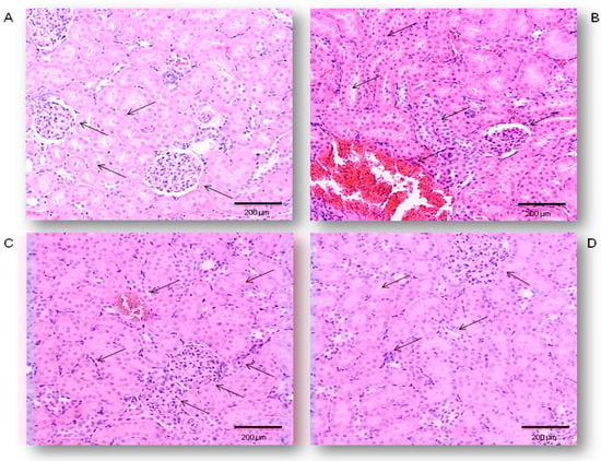 Protective effects of simvastatin pretreatment against LPS-induced acute renal damages, Hematoxylin and Eosin (H&E) method, 200× magnified images, black arrows indicates the gromeruls and tubules. (A) Appearance of renal tissue of control animals, (B) renal tissue challenged with LPS, (C) renal tissue from simvastatin 20 group, (D) renal tissue from simvastatin 40 group. Histopathological analysis revealed decreased renal inflammatory damages in both simvastatin-treated groups, while severe alterations persisted only in the LPS-treated group.