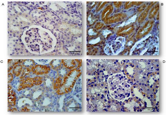 The TUNEL (Terminal deoxynucleotidyl transferase-mediated dUTP Nick End Labeling) assay was used to assess the apoptosis of renal tubular cells. To perform TUNEL staining on paraffin-embedded sections (4–6 μm thickness), we used the In-Situ Cell Death Detection Kit POD (Roche Molecular Biochemicals, Basel, Switzerland, Cat. No 11 684 817 910) according to the manufacturer’s instructions. Renal tissue slides were incubated with anti-fluorescein antibody conjugated with horseradish peroxidase (POD), and then color development was performed using diaminobenzidine (DAB) substrate. According to these instructions, negative (incubation with Label Solution, instead of TUNEL reaction) and positive controls (incubation with DNase I recombinant, grade I) were performed.