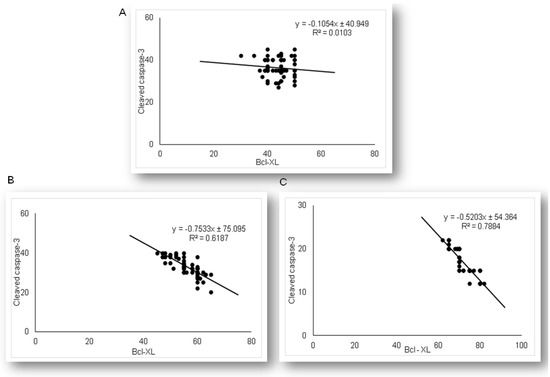 The correlations are shown for Bcl-XL and cleaved-caspase-3 in the renal tubular epithelial cells: (A) LPS group only, (B) simvastatin 20 mg/kg group, (C) simvastatin 40 mg/kg group.