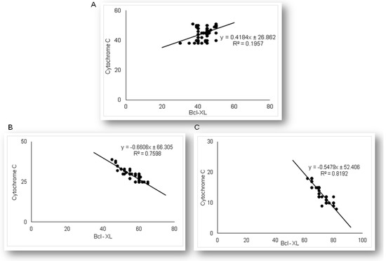 The correlations are shown for Bcl-XL and cytochrome C in the renal tubular epithelial cells: (A) LPS group only, (B) simvastatin 20 mg/kg group, (C) simvastatin 40 mg/kg group.